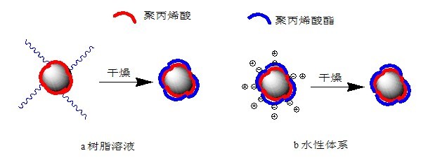 HT A20分子中的錨固部分由(甲基)丙烯酸、磷酸的均聚物或共聚物組成,通過(guò)和鈦白粉間的吸引力(配位作用、共價(jià)鍵)吸附在粒子表面,將粒子隔離開來(lái)。和樹脂相容的穩(wěn)定部分由丙烯酸酯、甲氧基聚丙二醇丙烯酸酯無(wú)規(guī)共聚物組成,賦予表面改性后的鈦白粉粒子良好的再分散性,并且能穩(wěn)定均勻分散在樹脂溶液和溶劑揮發(fā)后的樹脂中。在體系干燥過(guò)程中以及干燥后,和樹脂相容的部分能包覆在鈦白粉粒子表面,防止粒子聚集,使得鈦白粉粒子在樹脂中能均勻分散。圖2表示改性劑HT A20處理鈦白粉粒子后,HT A20在粒子表面的形態(tài)。圖2a表示在樹脂溶液或溶劑中,干燥前,改性劑的錨固部分和鈦白粉粒子間通過(guò)共價(jià)鍵、配位鍵結(jié)合在粒子表面上,聚丙烯酸酯部分充分伸展,通過(guò)空間位阻作用穩(wěn)定粒子;干燥后,聚丙烯酸酯部分包覆在粒子上或和樹脂基體互相滲透。圖2b表示在水性體系中,干燥前,改性劑的聚丙烯酸錨固部分和鈦白粉粒子間通過(guò)共價(jià)鍵、配位鍵結(jié)合在粒子表面上,依靠靜電斥力穩(wěn)定粒子;干燥后,聚丙烯酸酯部分包覆在粒子上或和樹脂互相滲透??梢?jiàn),雙親型嵌段聚合物改性劑HT A20對(duì)鈦白粉進(jìn)行有機(jī)表面處理后,在有機(jī)溶劑體系和水性體系中,都能提高鈦白粉在介質(zhì)中的分散穩(wěn)定性并改善鈦白粉和樹脂的相容性。